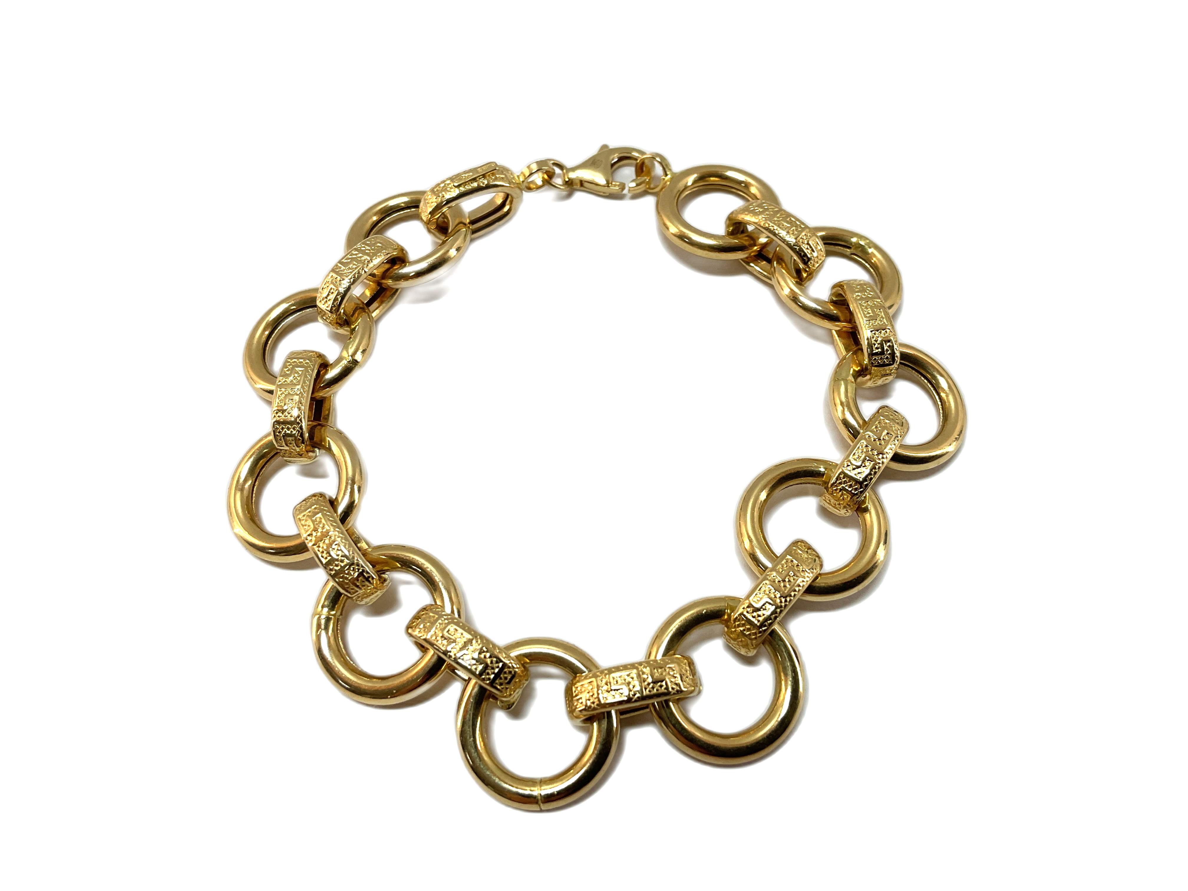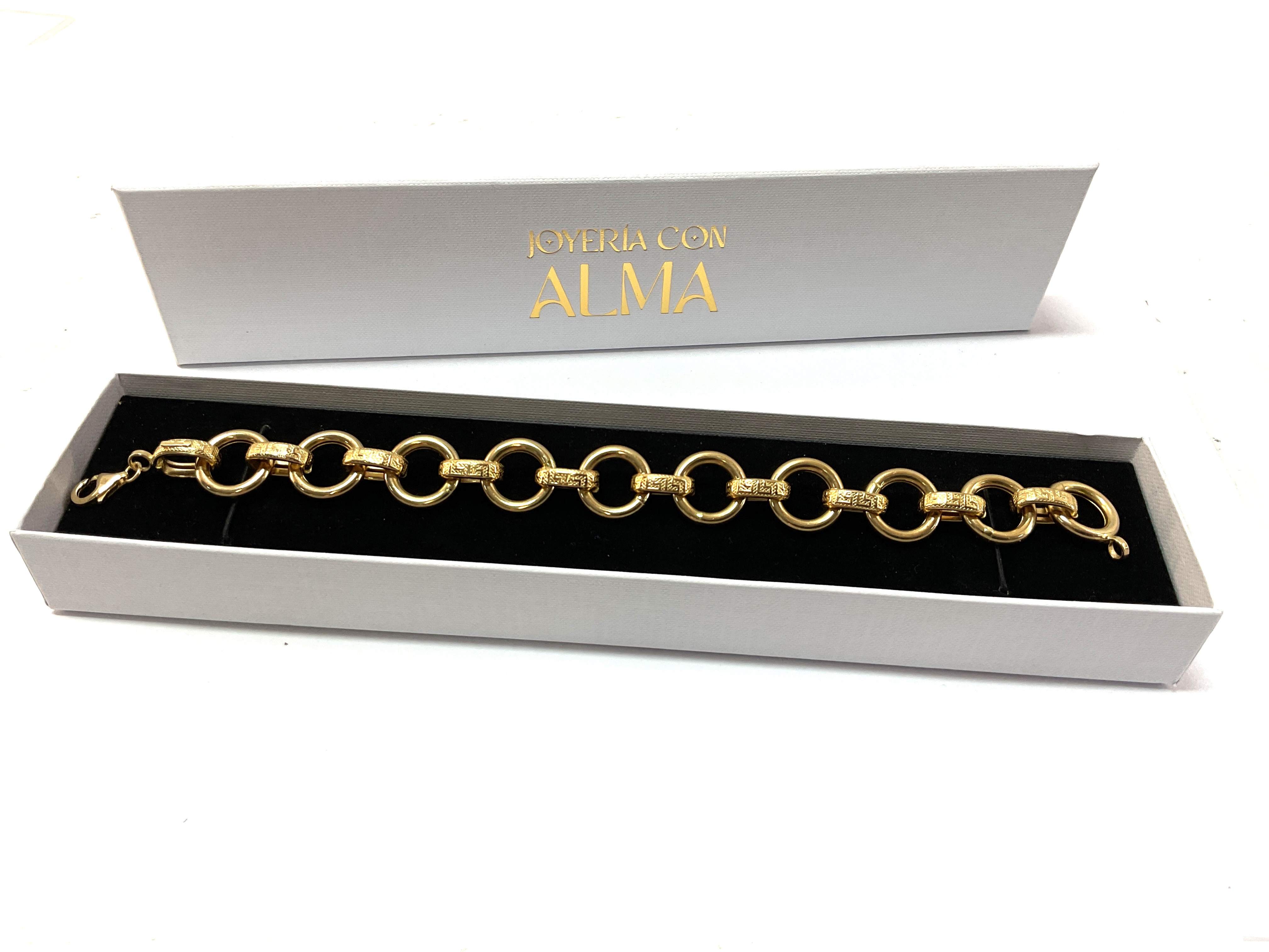 O elo tipo rolo confere à pulseira um aspecto clássico e refinado, permitindo que a luz se reflita naturalmente em cada elo e criando um efeito visual que realça a beleza do ouro sem necessidade de adornos adicionais.