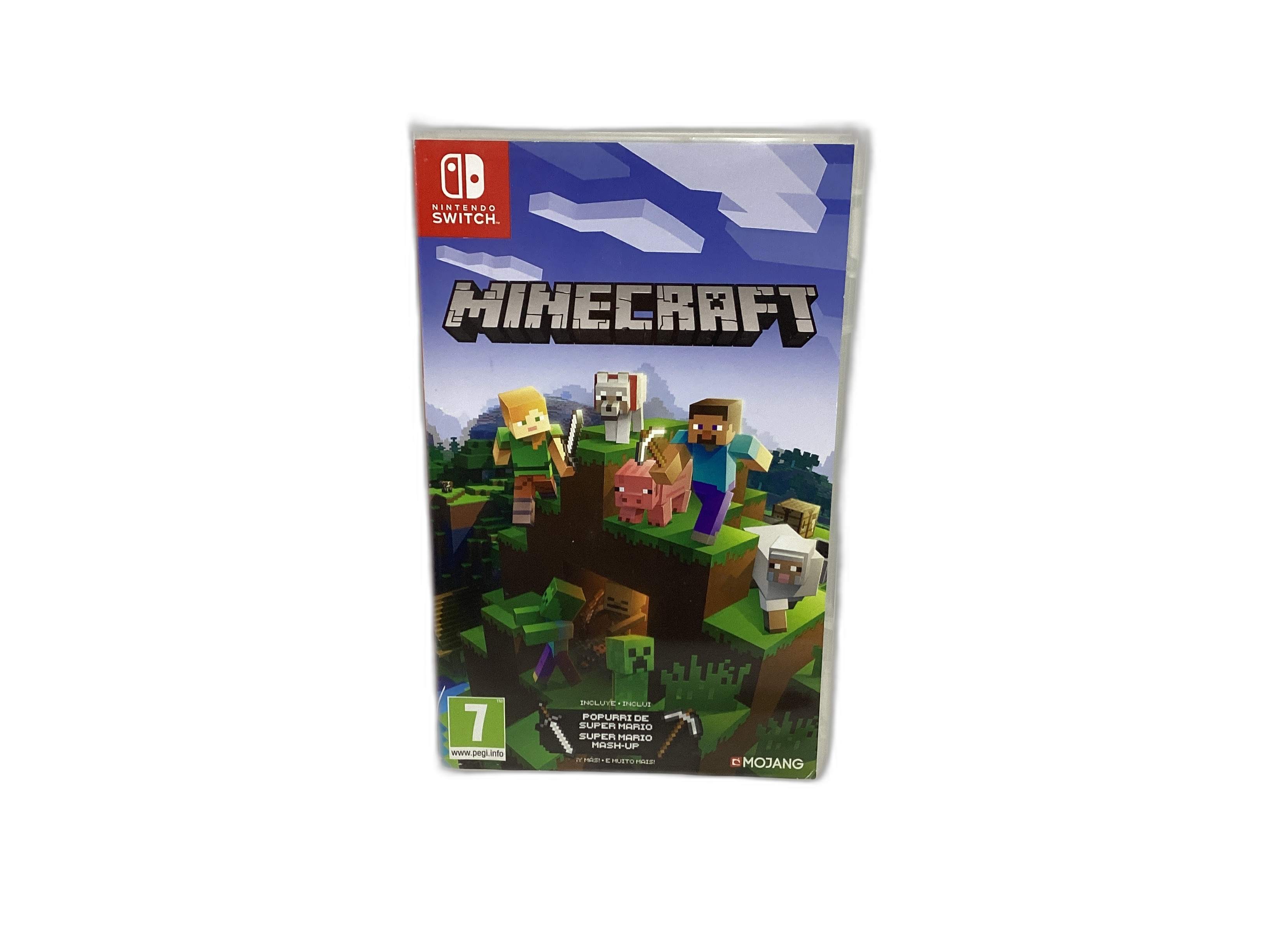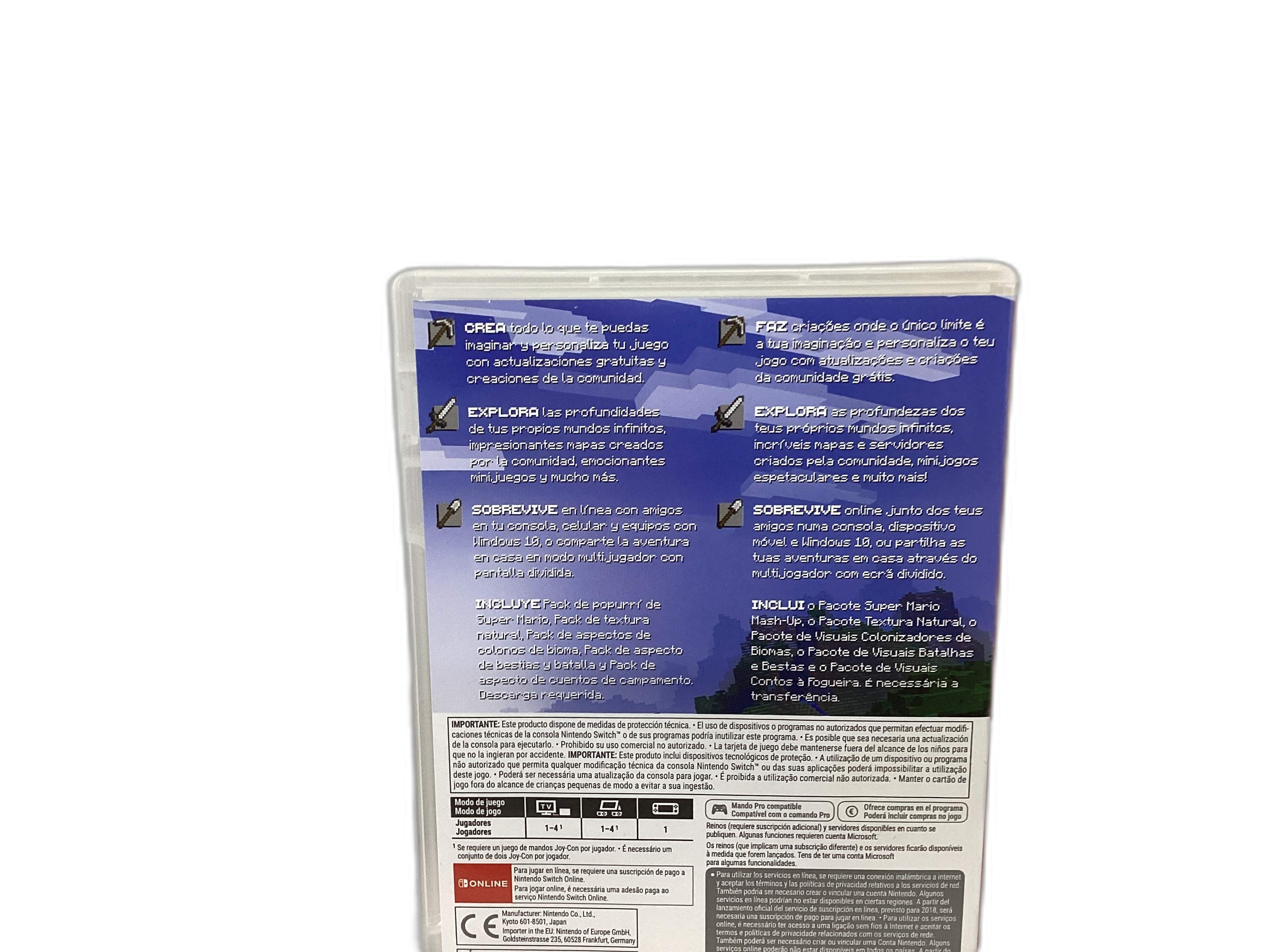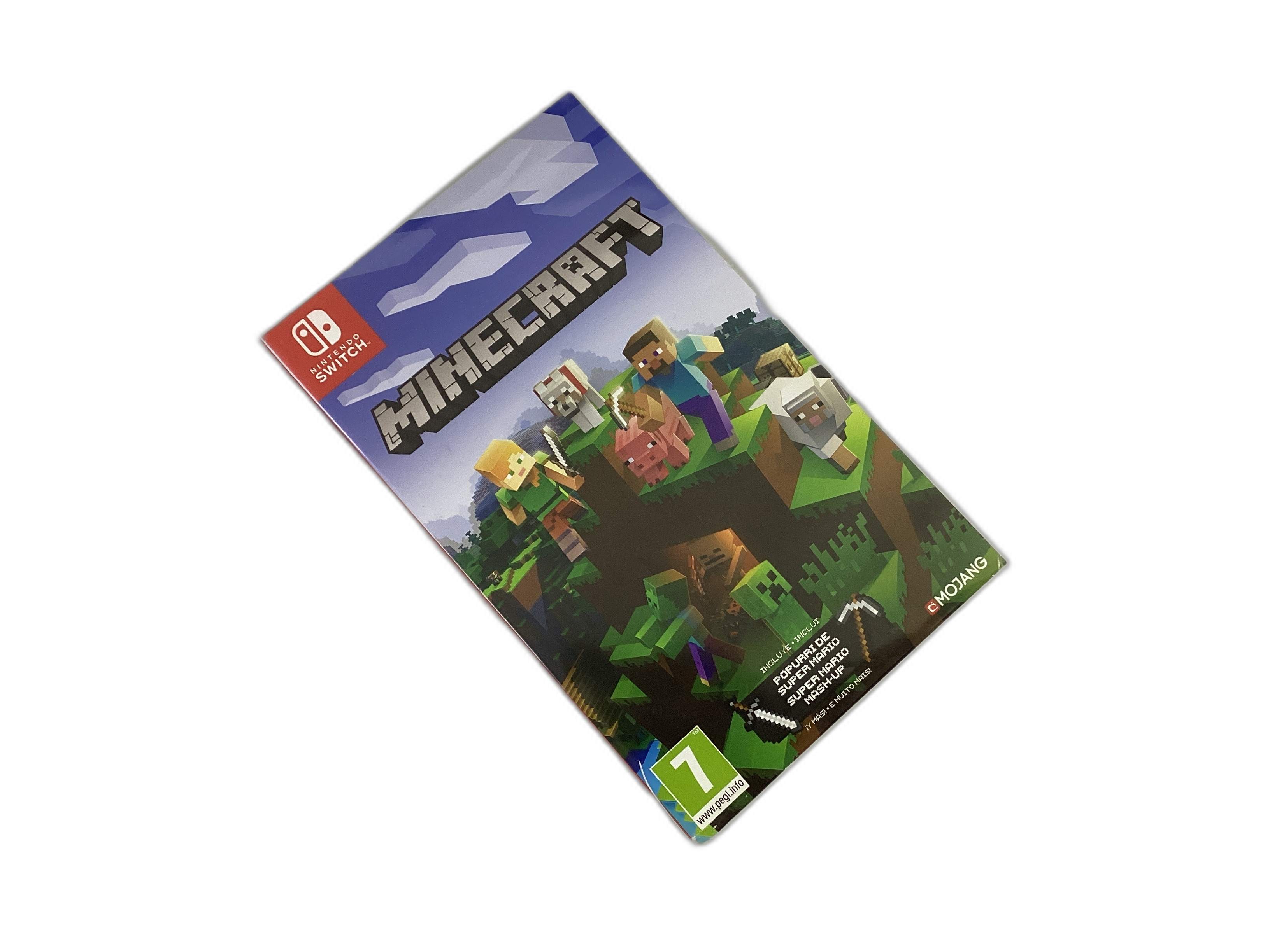A caixa original está incluída, o que garante a autenticidade e a integridade do conteúdo. O título "MINECRAFT N-SWITCH" é claro e informativo, deixando antever a natureza do produto.