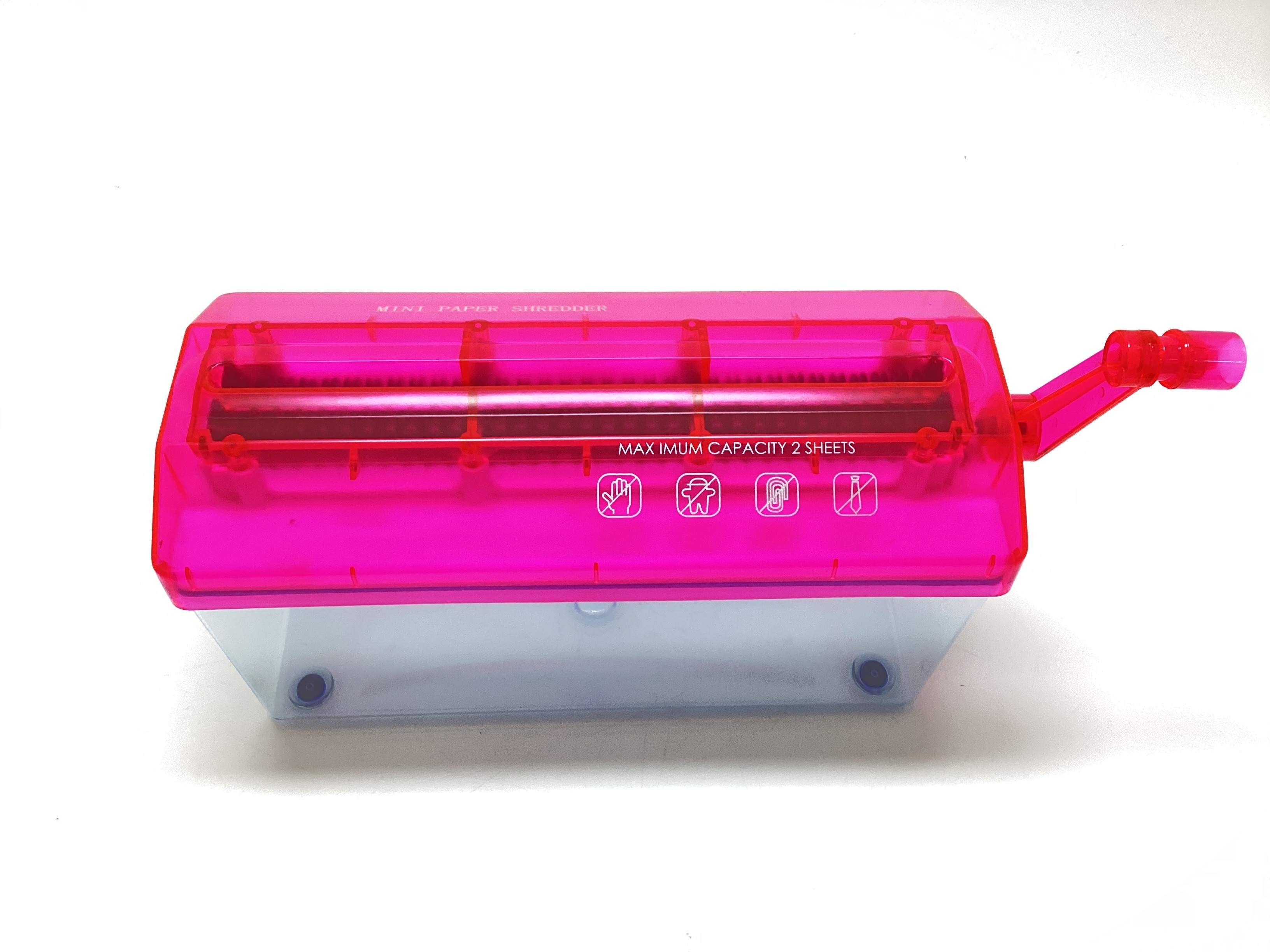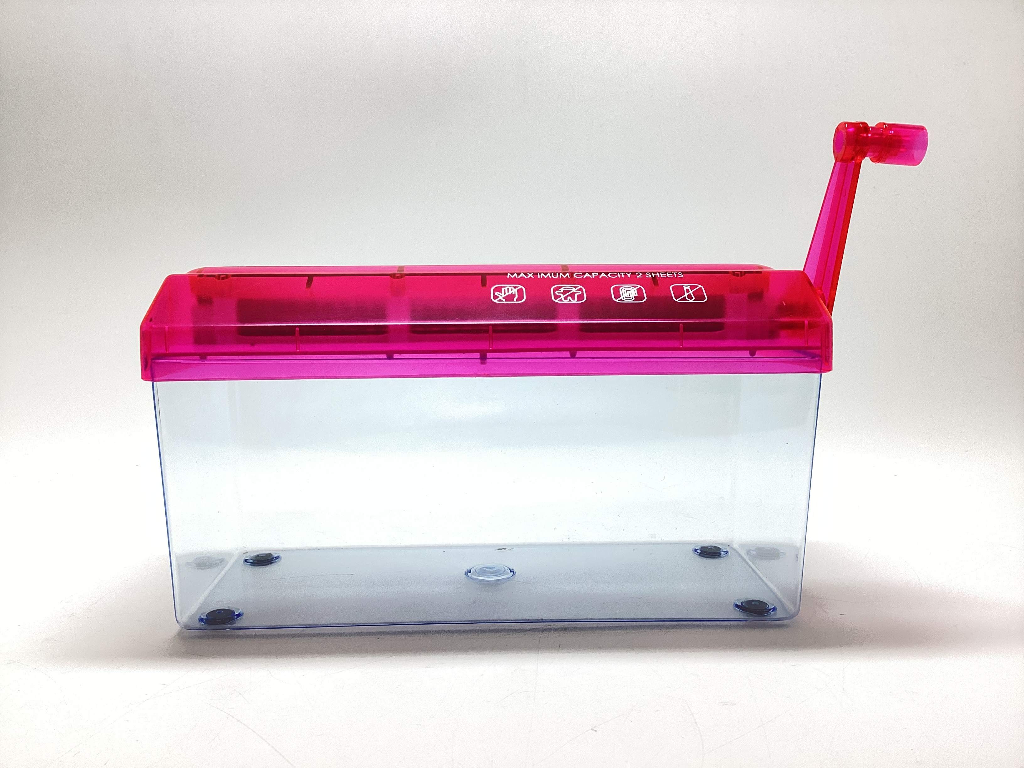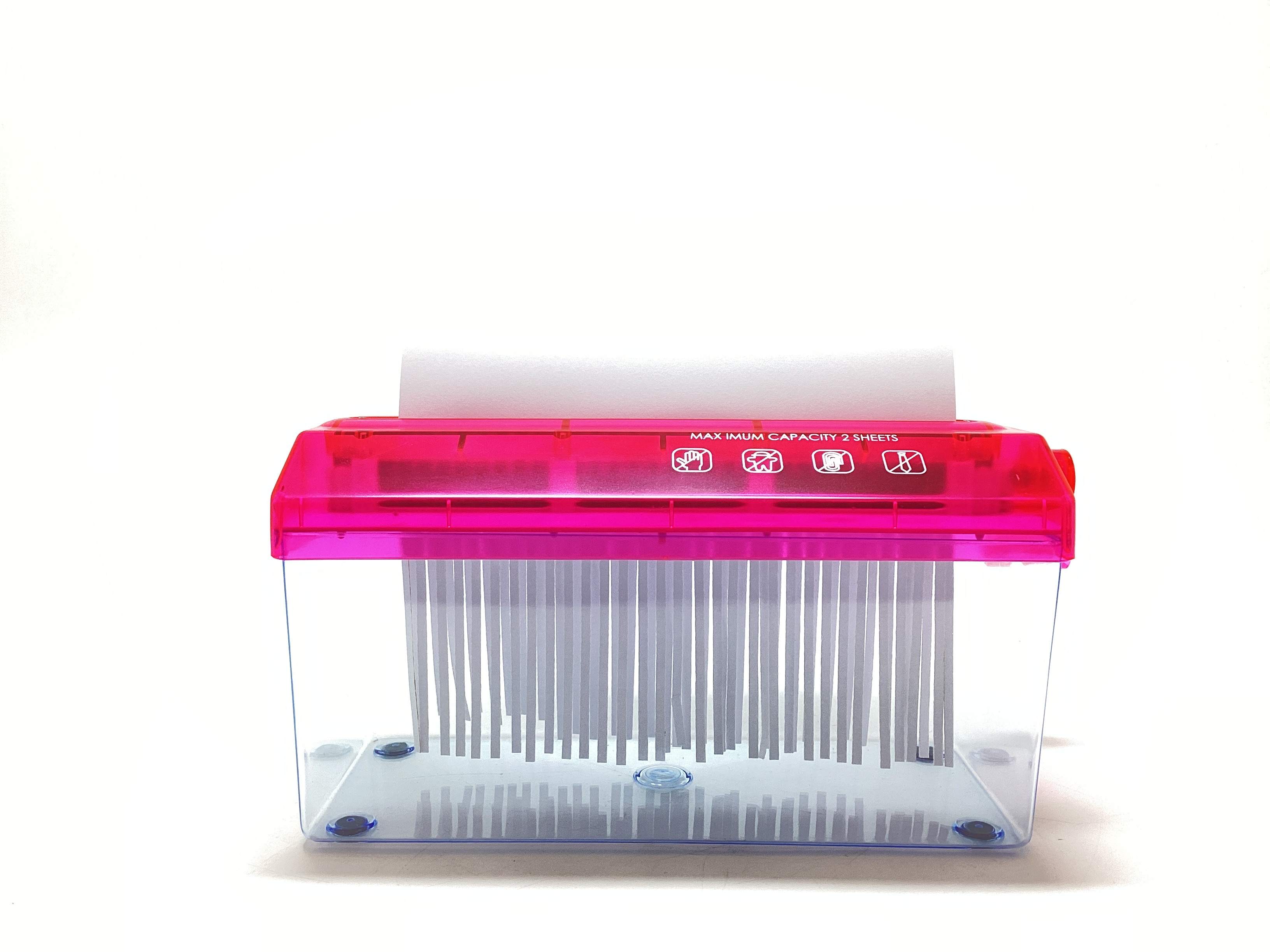 - descrição: picador de papel manual com capacidade de 2.8l, largura de entrada 220mm, corte de 3mm, design compacto com tolva transparente e tampa vermelha